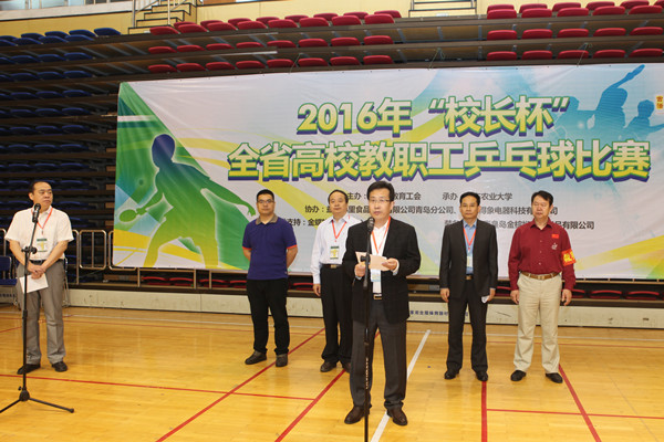 徐剑波在致辞时说,山东农业大学历来重视体育工作和体育文化建设,创新体育教育教学,丰富校园体育文化,关心师生身心健康,师生员工的强身健体意识不断增强,竞技体育发展水平不断提高。此次全省高校教职工乒乓球比赛的举办,必将在促进职工加深友谊、陶冶情操、提高技艺上起到积极作用,也必将在增强高校互动、加强相互学习、加快学校发展上发挥积极的推动作用。徐剑波表示,2016年“校长杯”全省高校教职工乒乓球比赛在我校举办,充分体现了省教育厅、教育工会对我校的信任,我们会全力以赴为比赛做好各项服务工作。兄弟高校各位朋友的到来更为我们提供了学习交流的好机会,希望各位在比赛之余,多到校园走一走、看一看,留下宝贵的意见和建议,并在今后更加关心支持山东农业大学的发展。 宋志明发表了热情洋溢的讲话,他说,组织这次比赛的目的是希望大家在繁忙的事务中抽出时间强筋骨、增知识、调情感、强意志、增进身心健康,以健康的体魄积极推进党的教育事业改革发展,同时也要通过比赛进一步动员广大教职工积极参与体育锻炼,增强身体运动意识,丰富校园文化生活和建设,营造更加和谐的工作氛围。他希望参赛选手在比赛中坚持“友谊第一、比赛第二”,遵守比赛规则,尊重比赛对手,发扬奋发有为、团结互助的精神,全力以赴,以球会友,促进交流。