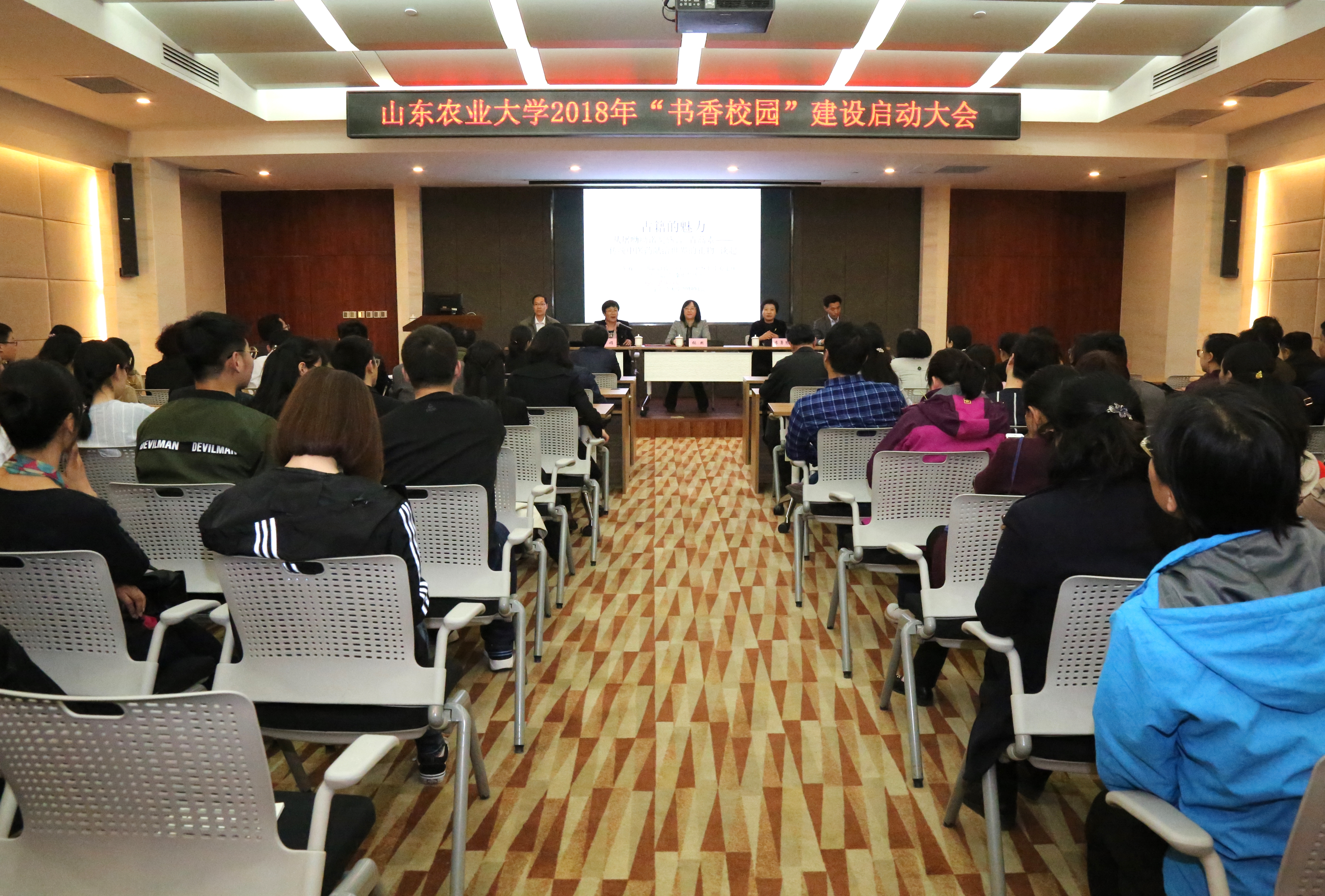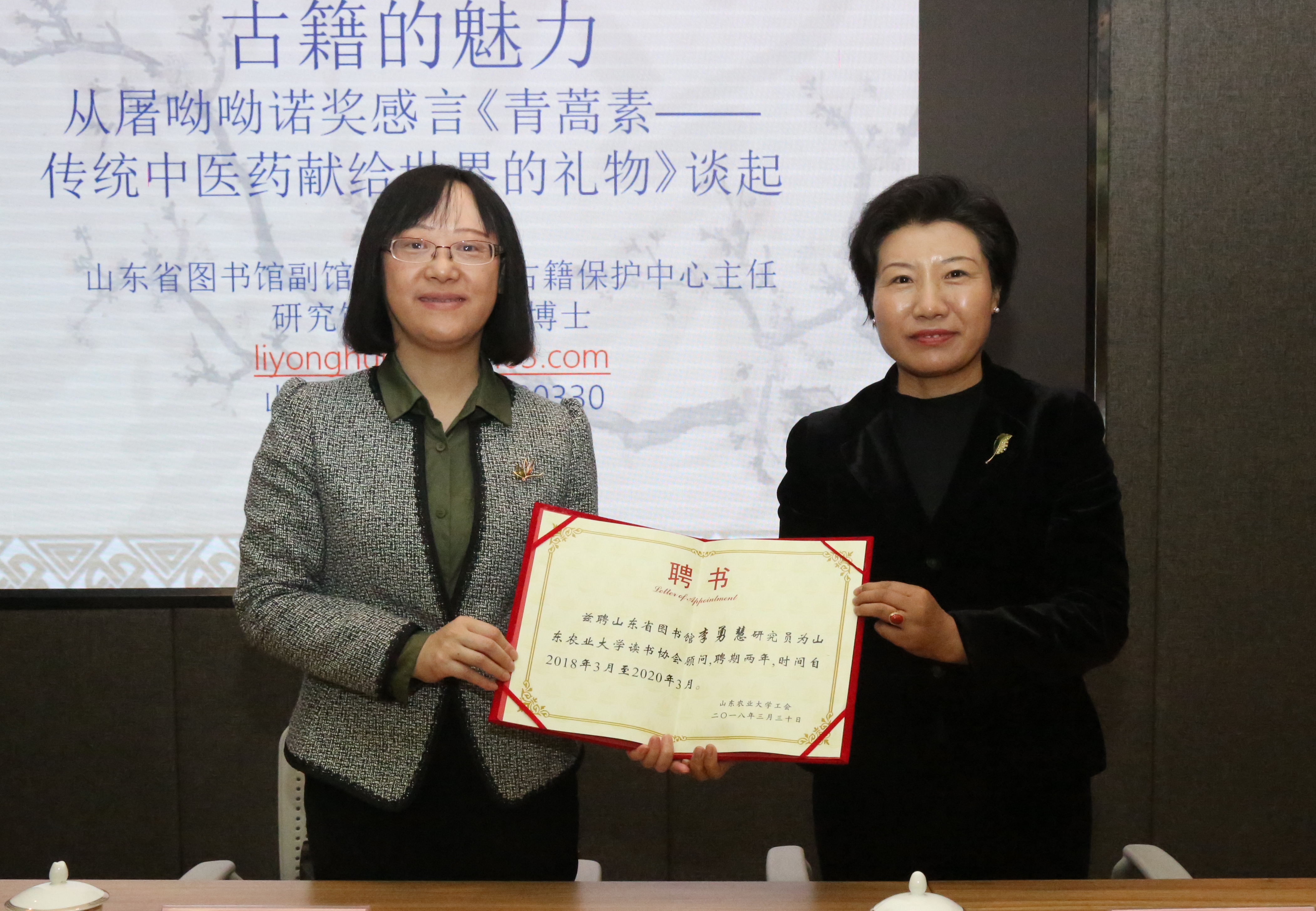 3月30日,我校“书香校园”活动表彰暨2018年度启动大会在科技创新楼一楼报告厅举行。副校长张然出席会议,山东省图书馆副馆长、山东省古籍保护中心副主任李勇慧受邀参加并作报告。张然为李勇慧颁发山东农业大学“读书协会”名誉顾问聘书。校工会、校团委、图书馆主要负责同志,各部门工会代表、师生代表等参加活动。