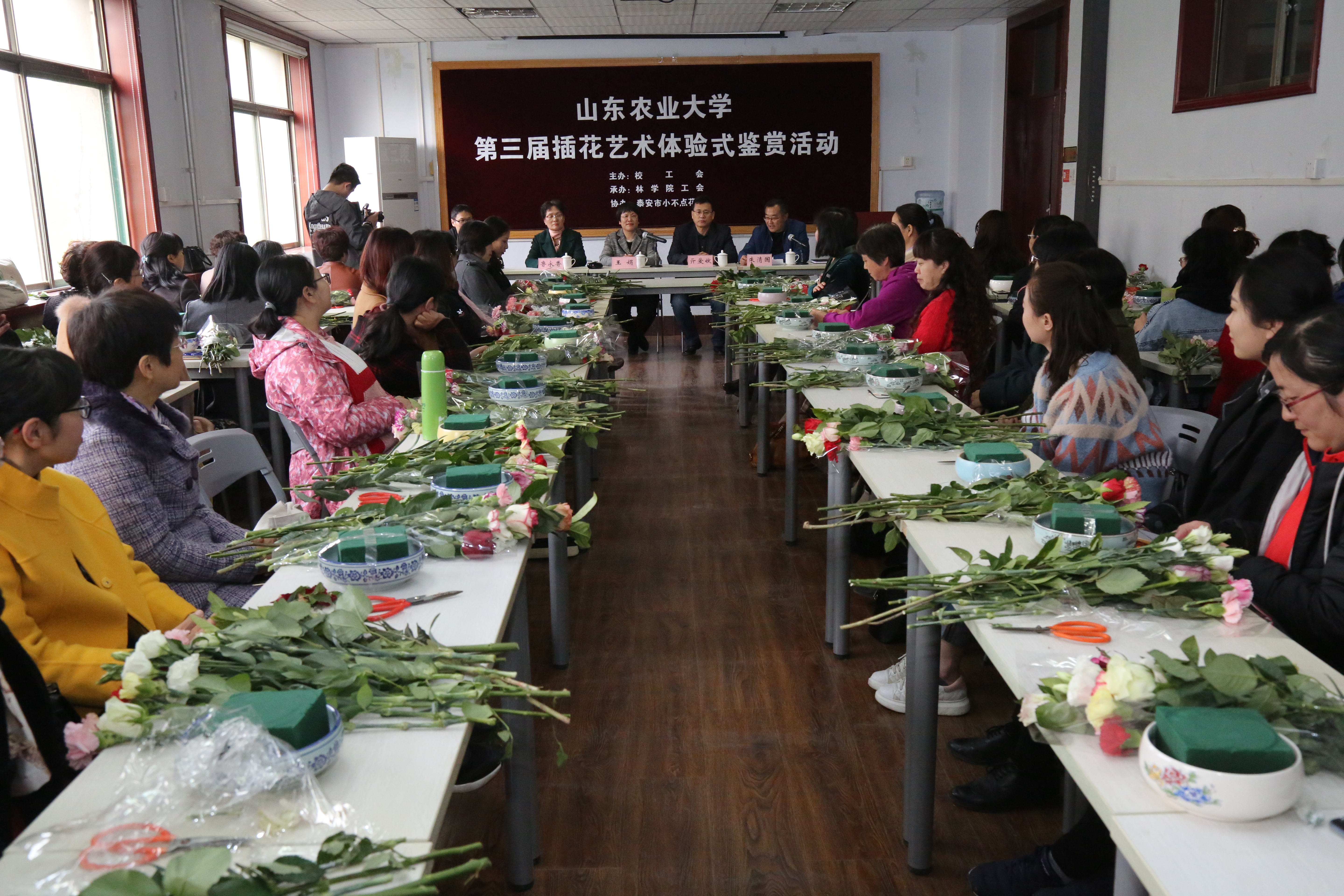 暖风和煦,春意盎然,4月12日,山东农业大学举办第三届教职工插花艺术体验式鉴赏活动。 饱含着对教职工的热情和祝福,林学院党委书记亓爱收致欢迎词。随后,校工会主席王娟讲话,她指出,工会将紧紧围绕教职工精神文化需求,依托魅力阳光女教职工工作坊等创新文化活动,引领广大教职工修养身心,提升素养,努力打造温馨和谐的校园氛围,激发广大教职工干事创业、为学校事业发展作贡献的热情。 活动邀请花艺师为大家讲解插花的操作过程、色彩配置和搭配技巧。随后,老师们开始动手实践,在轻松愉快的氛围中亲自体验插花艺术。不久,一件件精致唯美的插花作品相继诞生,它们中有的主次分明,有的色彩艳丽,有的清新脱俗。参会教职工纷纷拍照留念,捧着亲手做的花艺作品,脸上洋溢着喜悦的笑容。 此次活动由校工会主办,林学院承办,小不点花艺店协办,来自全校20个分工会的近60名教职工参加。