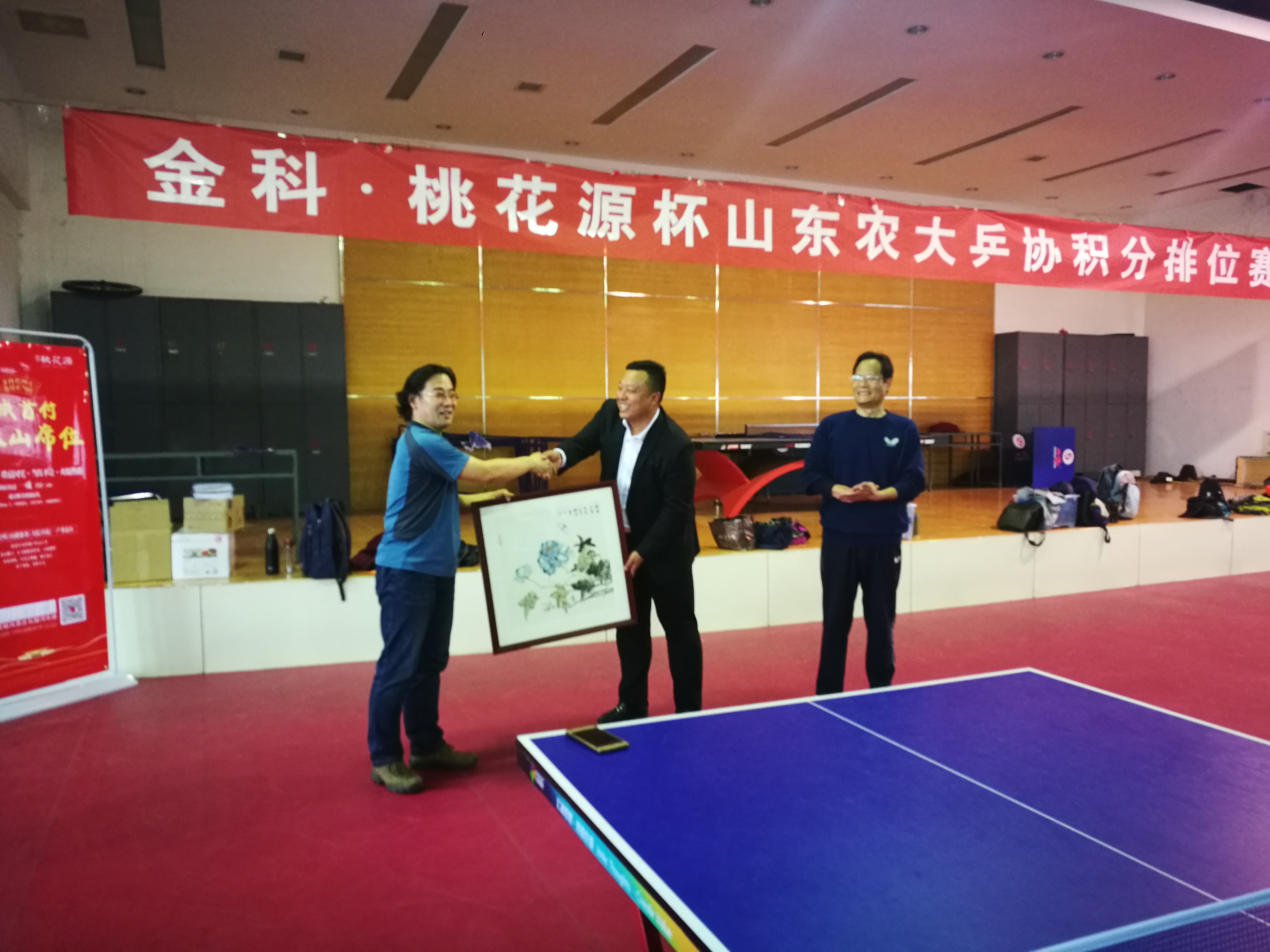 4月13日,由“金科·桃花源地产”冠名的我校教职工乒协积分排位赛在校本部乒乓球馆内举行。这是乒协引进社会知名企业助力教职工体育活动的一次有效尝试。 山东农业大学教职工乒乓球协会,是学校工会领导下的群众性体育运动组织,现有会员90余人,是山东农业大学目前会员人数最多、开展群体运动活动最丰富的协会之一。乒乓球协会为广大教职工提供了一个切磋乒乓球技艺,增进互相交流,锻炼强健体魄的平台。乒协推出的积分排位赛受到广大乒乓球爱好者的喜爱。该赛事每周六下午3:30在本部乒乓球馆内举行,为团体赛的赛制。 冠名仪式上,乒协会员、艺术学院柳涛教授,代表乒协向金科·桃花源地产赠送了自己的精品画作,感谢企业对乒协的支持。金科·桃花源地产感谢农大教职工对企业的关注,表示将持续支持山东农业大学乒乓球协会的活动。 企业冠名学校体育活动,促进了学校与社会的联系,拓展了教师科研服务企业的范围,也为提高人才培养质量、扩大学生就业渠道提供了有利条件。